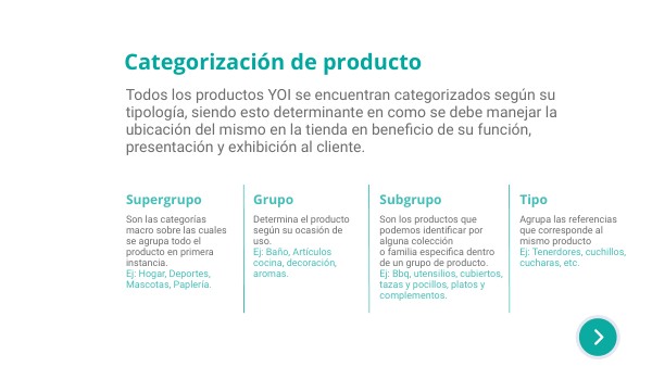 Todos los productos YOI se encuentran categorizados según su tipología, siendo esto determinante en como se debe manejar la ubicación del mismo en la tienda en beneficio de su función, presentación y exhibición al cliente.