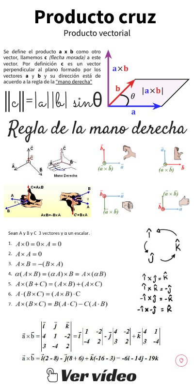 Se define el producto a x b como otro vector, llamemos c (flecha morada) a este vector. Por definición c es un vector perpendicular al plano formado por los vectores a y b y su dirección está de acuerdo a la regla de la “mano derecha”