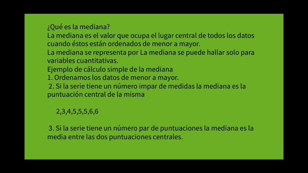 ¿Qué es la mediana? La mediana es el valor que ocupa el lugar central de todos los datos cuando éstos están ordenados de menor a mayor. La mediana se representa por La mediana se puede hallar solo para variables cuantitativas. Ejemplo de cálculo simple de la mediana 1. Ordenamos los datos de menor a mayor. 2. Si la serie tiene un número impar de medidas la mediana es la puntuación central de la misma 2,3,4,5,5,5,6,6 3. Si la serie tiene un número par de puntuaciones la mediana es la media entre las dos puntuaciones centrales.