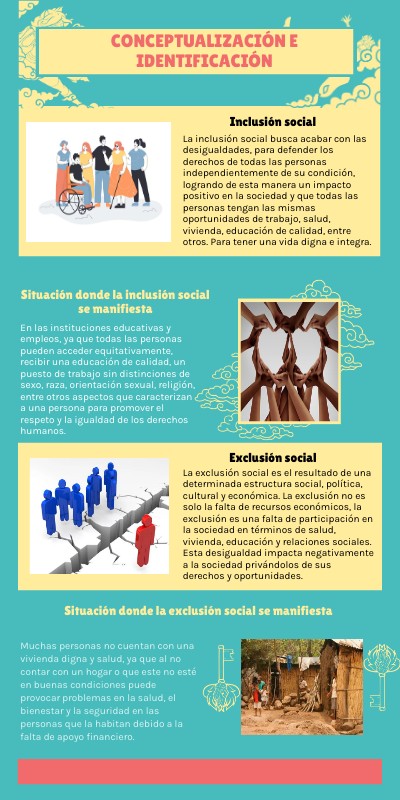 La inclusión social busca acabar con las desigualdades, para defender los derechos de todas las personas independientemente de su condición, logrando de esta manera un impacto positivo en la sociedad y que todas las personas tengan las mismas oportunidades de trabajo, salud, vivienda, educación de calidad, entre otros. Para tener una vida digna e integra.