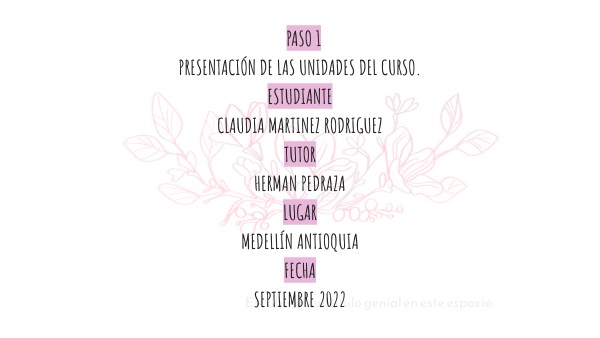 Paso 1Presentación de las unidades del curso.ESTUDIANTE cLAUDIA MARTINEZ RODRIGUEZ TUTOR HERMAN PEDRAZA lUGAR MeDELLíN ANTIOQUIA FECHA SEPTIEMBRE 2022