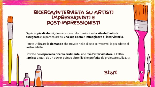 Ogni coppia di alunni, dovrà cercare informazioni sulla vita dell'artista assegnato e in particolare su una sua opera e immaginare di intervistarlo.Potete utilizzare le domande che trovate nelle slide o scrivere voi le più adatte al vostro artista. Dovrete poi esporre la ricerca oralmente, uno farà l'intervistatore e l'altro l'artista aiutati da un power-point o altro file che preferite da proiettare sulla LIM.
