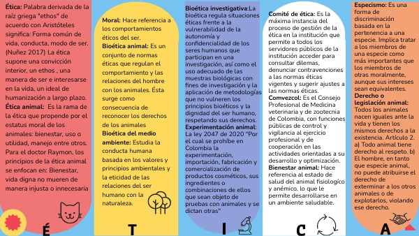Ética: Palabra derivada de la raíz griega "ethos" de acuerdo con Aristóteles significa: Forma común de vida, conducta, modo de ser.(Nuñez 2017) La ética supone una convicción interior, un ethos , una manera de ser e interesarse en la vida, un ideal de humanización a largo plazo. Ética animal: Es la rama de la ética que propende por el estatus moral de los animales: bienestar, uso o utilidad, manejo entre otros. Para el doctor Raymon, los principios de la ética animal se enfocan en: Bienestar, vida digna no mueren de manera injusta o innecesaria