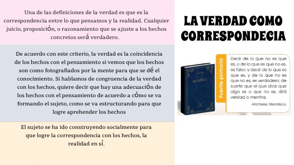 Una de las definiciones de la verdad es que es la correspondencia entre lo que pensamos y la realidad. Cualquier juicio, proposición, o razonamiento que se ajuste a los hechos concretos será verdadero.