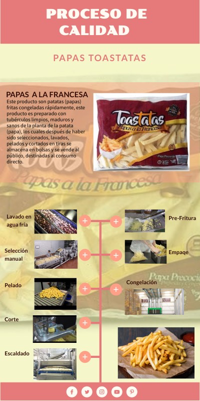 Este producto son patatas (papas) fritas congeladas rápidamente, este producto es preparado con tubérculos limpios, maduros y sanos de la planta de la patata (papa), los cuales después de haber sido seleccionados, lavados, pelados y cortados en tiras se almacena en bolsas y se vende al público, destinadas al consumo directo.