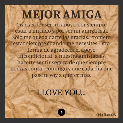 Gracias por ser mi apoyo, por siempre estar a mi lado y por ser mi amiga leal. Solo me queda darte las gracias. Prometo estar siempre cuando me necesites. Otra forma de agradecer el apoyo incondicional a nuestra amistad es hacerte sentir segura de que siempre podras contar conmigo y que cada dia que pase te voy a querer mas.