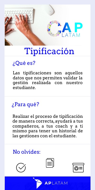 Realizar el proceso de tipificación de manera correcta, ayudará a tus compañeros, a tus coach y a ti mismo para tener un historial de las gestiones con el estudiante.