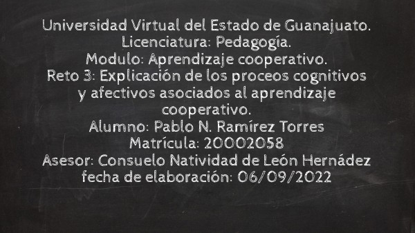 Universidad Virtual del Estado de Guanajuato.Licenciatura: Pedagogía.Modulo: Aprendizaje cooperativo. Reto 3: Explicación de los proceos cognitivos y afectivos asociados al aprendizaje cooperativo. Alumno: Pablo N. Ramírez Torres Matrícula: 20002058 Asesor: Consuelo Natividad de León Hernádez fecha de elaboración: 06/09/2022