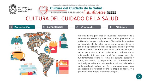 América Latina presenta un inusitado incremento de la enfermedad crónica que se asocia principalmente con estilos de vida poco saludables. El estudio de la cultura del cuidado de la salud surge como respuesta a un problema prioritario de la salud pública en la región y se relaciona con la comprensión de la conducta cotidiana de las personas en este contexto. A continuación en esta unidad introductoria, se definen unos conceptos fundamentales sobre el tema de cultura, cuidado y salud, se analiza el significado de la competencia cultural y se esboza la relación de la cultura del cuidado de la salud en la vida actual. Se espera con esto generar un espacio de reflexión sobre la propia conducta y la posibilidad de propiciar una vida mejor.