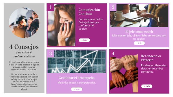 El preferencialismo se presenta al dar un trato especial a alguien sin que existan razones objetivas que lo sustenten. No necesariamente se da al tener una amistad con alguien del equipo o al tener mayor afinidad y menos al dar beneficios a alguien que ha tenido un buen rendimiento laboral.