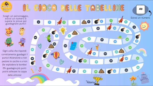 Ogni volta che rispondi correttamente guadagni 1 punto! Attenzione a non pestare le cacche e a non far esplodere le bombe! Chi guadagna più punti potrà sollevare la coppa della vittoria!