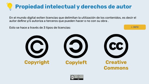 En el mundo digital exiten licencias que delimitan la utilización de los contenidos, es decir el autor define y/o autoriza a terceros que pueden hacer o no con su obra . Esto se hace a través de 3 tipos de licencias:
