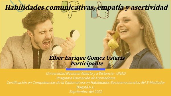 Habilidades comunicativas, empatía y asertividad Romero A. (2010). Habilidades Sociales Que Mejoran La Comunicación Interpersonal. Revista digital para los profesionales de la enseñanza. https://www.feandalucia.ccoo.es/docu/p5sd7094.pdf OVA Comunicación Asertiva Escobar, S. (2018). OVA Comunicación Asertiva, [Archivo de html5]. https://repository.unad.edu.co/reproductor-ova/10596_18115/story_html5.html Referencias complementarias Egea Tatiana. (julio 12 de 2022). Tercera Webconferencia curso Habilidades socioemocionales del E-Mediador. Colombia. UNAD. https://www.youtube.com/watch?v=IZtflZbgvPc Montolío, Estrella. Cómo comunicarnos con asertividad. España: BBVA y EL PAÍS. Vídeo versión introductoria https://www.youtube.com/watch?v=jvxuQEe_0-w Montolío, Estrella. Cómo comunicarnos con asertividad. España: BBVA y EL PAÍS. Vídeo versión completa https://www.youtube.com/watch?v=W3KfkeYtW2w