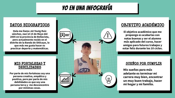 Hola me llamo Jet Youtg Ruiz sánchez, nací el 15 de Mayo del 2005 en la provincia de Bellavista, pero actualmente resido en el distrito de la Banda de Shilcayo, lo que más me gusta hacer es practicar deporte y matemáticas.
