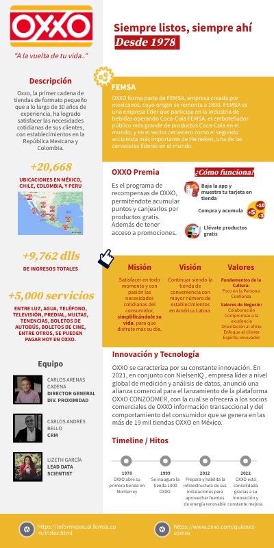 OXXO forma parte de FEMSA, empresa creada por mexicanos, cuyo origen se remonta a 1890. FEMSA es una empresa líder que participa en la industria de bebidas operando Coca-Cola FEMSA, el embotellador público más grande de productos Coca-Cola en el mundo; y en el sector cervecero como el segundo accionista más importante de Heineken, una de las cerveceras líderes en el mundo.