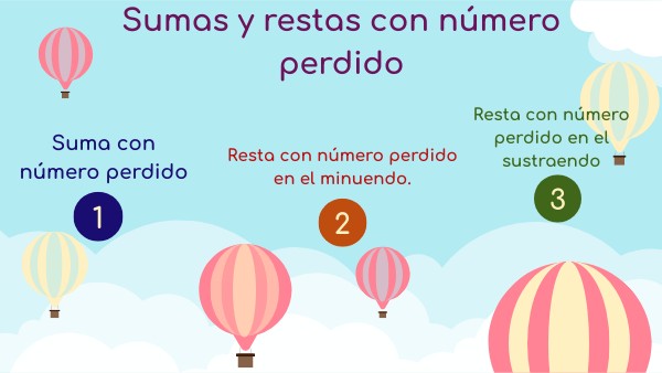 Al total le restamos el o los sumandos que conocemos y la diferencia será el sumando perdido.