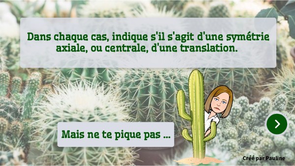 Dans chaque cas, indique s'il s'agit d'une symétrie axiale, ou centrale, d'une translation.