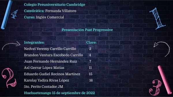 Colegio Preuniversitario Cambridge Catedrática: Fernanda Villatoro Curso: Inglés Comercial Presentación Past Progressive Integrantes: Clave: Nedvel Yeremy Carrillo Carrillo 2 Brandon Ventura Escobedo Carrillo 4 Juan Fernando Hernández Ruíz 7 Axl Gerrar López Matias 11 Eduardo Gudiel Recinos Martínez 15 Karolay Yadira Rivas López 16 5to. Perito Contador JM Huehuetenango 15 de septiembre de 2022
