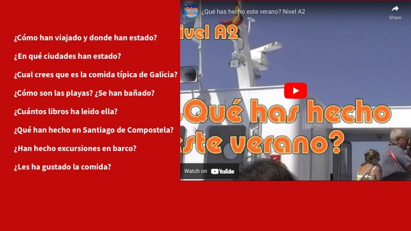¿Cómo han viajado y donde han estado? ¿En qué ciudades han estado? ¿Cual crees que es la comida típica de Galicia? ¿Cómo son las playas? ¿Se han bañado? ¿Cuántos libros ha leido ella? ¿Qué han hecho en Santiago de Compostela? ¿Han hecho excursiones en barco? ¿Les ha gustado la comida?