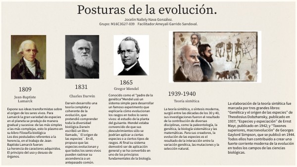 Expone sus ideas transformistas sobre el origen de los seres vivos. Para Lamarck la gran variedad de especies en el planeta se produjo de manera gradual y sucesiva: de las más simples a las más complejas, esto lo plasmo en su kibro Filosofía biológicaLos dos postulados referentes a la herencia, en el trabajo de Jean-Baptiste Lamarck fueron: La herencia de caracteres adquiridos. El principio del uso y desuso de órganos.