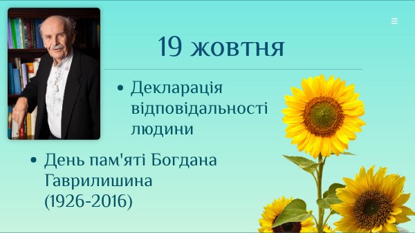 Всеукраїнський День відповідальності людини – державне свято України, яке, починаючи з 2021 року, щороку відзначається 19 жовтня у день народження Богдана Гаврилишина, автора