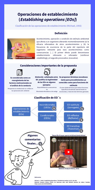 Referencias:Michael, J. (1993). Establishing Operations. The Behavior Analyst, 16 (2), 191-206 Behavior Analysis History (2015). An Interview with Jack Michael [Archivo de video]. Youtube. https://youtu.be/Zn4OO0ADXMQ