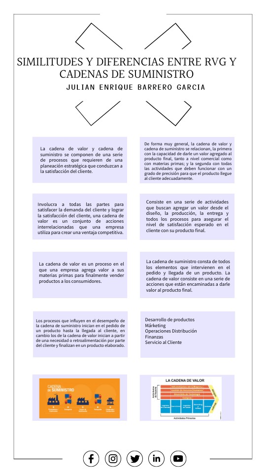 Los procesos que influyen en el desempeño de la cadena de suministro inician en el pedido de un producto hasta la llegada al cliente, en cambio los de la cadena de valor inician a partir de una necesidad o retroalimentación por parte del cliente y finalizan en un producto elaborado.