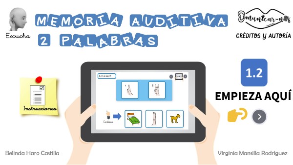 OBJETIVO GENERAL: - Mejorar o desarrollar la memoria auditiva. OBJETIVO ESPECÍFICO: - Recordar, de forma ordenada, series de dos palabras en orden directo. DESARROLLO DE LA ACTIVIDAD: Se le presentan al niño/a dos palabras de manera auditiva. Tras haberlas escuchado, el alumno/a deberá repetir las dos palabras en el mismo orden que han sido reproducidas pasando posteriormente a la siguiente pantalla. A continuación, el niño/a tendrá que seleccionar y arrastrar en el orden correcto, las dos palabras escuhadas . VARIANTES: Inventar una oración con algunas de las palabras que se proponen. Contar el número de sílabas de las palabras. Pragmática: qué es, para qué sirve…