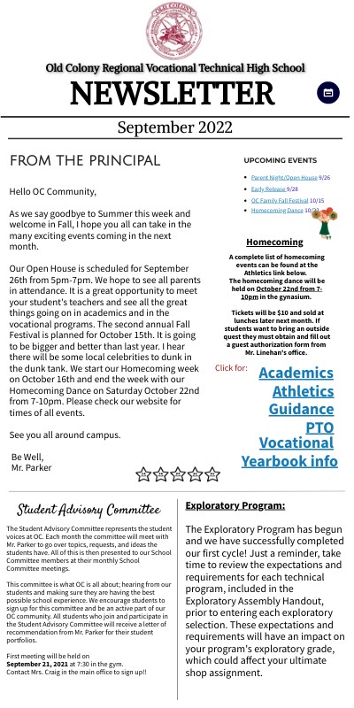 The Student Advisory Committee represents the student voices at OC. Each month the committee will meet with Mr. Parker to go over topics, requests, and ideas the students have. All of this is then presented to our School Committee members at their monthly School Committee meetings. This committee is what OC is all about; hearing from our students and making sure they are having the best possible school experience. We encourage students to sign up for this committee and be an active part of our OC community. All students who join and participate in the Student Advisory Committee will receive a letter of recommendation from Mr. Parker for their student portfolios. First meeting will be held on September 21, 2021 at 7:30 in the gym. Contact Mrs. Craig in the main office to sign up!!