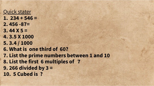 Quick stater 1. 234 + 546 = 2. 456 -87= 3. 44 X 5 = 4. 3.5 X 1000 5. 3.4 / 1000 6. What is one third of 60? 7. List the prime numbers between 1 and 10 8. List the first 6 multiples of 7 9. 266 divided by 3 = 10. 5 Cubed is ?