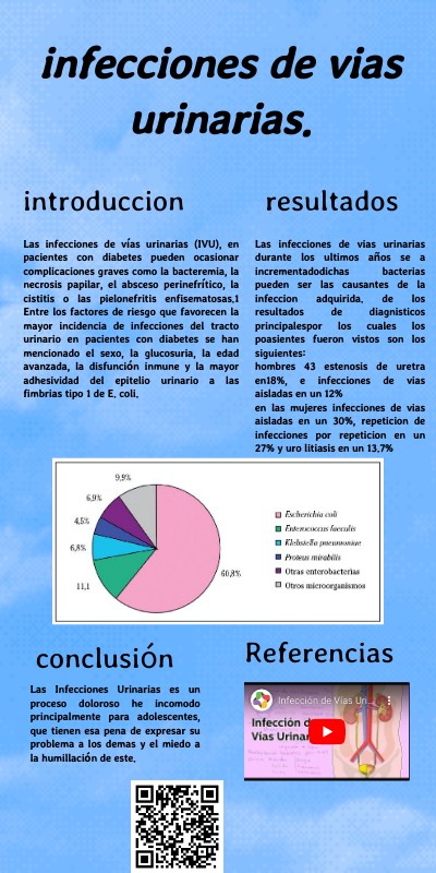 Las infecciones de vias urinarias durante los ultimos años se a incrementadodichas bacterias pueden ser las causantes de la infeccion adquirida. de los resultados de diagnisticos principalespor los cuales los poasientes fueron vistos son los siguientes:hombres 43 estenosis de uretra en18%, e infecciones de vias aisladas en un 12% en las mujeres infecciones de vias aisladas en un 30%, repeticion de infecciones por repeticion en un 27% y uro litiasis en un 13.7%