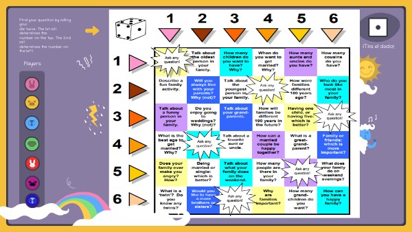 Find your question by rolling your die twice. The 1st roll determines the number on the top. The 2nd roll determines the number on the left