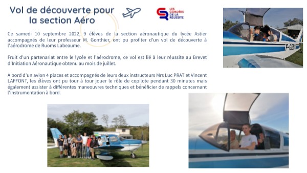 professeur M. Gonthier, ont pu profiter d'un vol de découverte à l'aérodrome de Ruoms Labeaume. Fruit d'un partenariat entre le lycée et l'aérodrome, ce vol est lié à leur réussite au Brevet d'Initiation