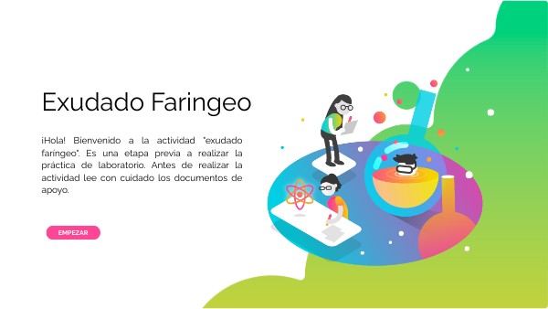 ¡Hola! Bienvenido a la actividad "exudado faríngeo". Es una etapa previa a realizar la práctica de laboratorio. Antes de realizar la actividad lee con cuidado los documentos de apoyo.