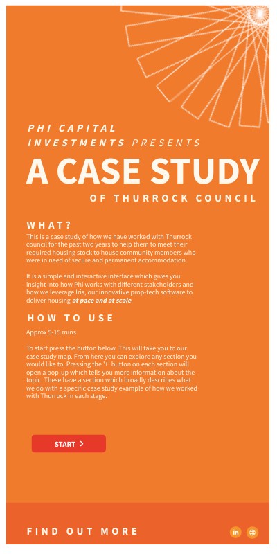 This is a case study of how we have worked with Thurrock council for the past two years to help them to meet their required housing stock to house community members who were in need of secure and permanent accommodation. It is a simple and interactive interface which gives you insight into how Phi works with different stakeholders and how we leverage Iris, our innovative prop-tech software to deliver housing at pace and at scale.