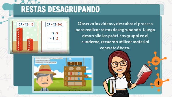 Observa los vídeos y descubre el proceso para realizar restas desagrupando . Luego desarrolla las prácticas grupal en el cuaderno, recuerda utilizar material concreto ábaco.