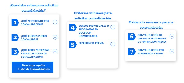 La aceptación de experiencia previa se considerará como equivalente a uno o más cursos del diplomado cuando la evidencia permita acreditar que posee los conocimientos y experiencia suficiente de acuerdo a lo establecido en el currículum del diplomado. La opción de realizar convalidación por experiencia previa solo será posible para académicos que ingresen a la UC en las categorías Asociado o Titular.Para solicitar la convalidación por experiencia previa por uno o más cursos del diplomado, el académico deberá contar con una experiencia mínima de 7 años de docencia universitaria.