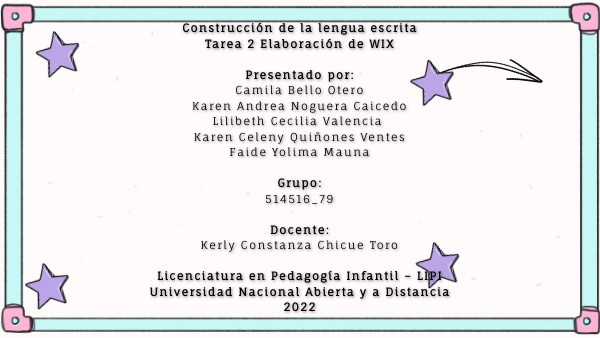 Construcción de la lengua escrita Tarea 2 Elaboración de WIX Presentado por: Camila Bello Otero Karen Andrea Noguera Caicedo Lilibeth Cecilia Valencia Karen Celeny Quiñones Ventes Faide Yolima Mauna Grupo: 514516_79 Docente: Kerly Constanza Chicue Toro Licenciatura en Pedagogía Infantil – LIPI Universidad Nacional Abierta y a Distancia 2022