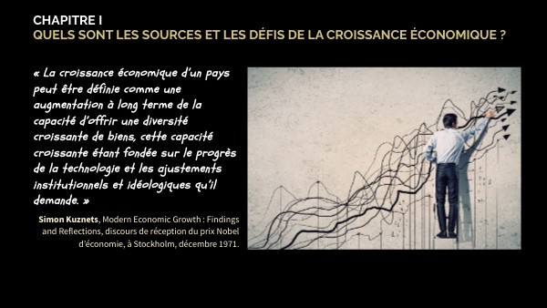 « La croissance économique d’un pays peut être définie comme une augmentation à long terme de la capacité d’offrir une diversité croissante de biens, cette capacité croissante étant fondée sur le progrès de la technologie et les ajustements institutionnels et idéologiques qu’il demande. »