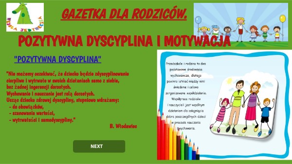"Nie możemy oczekiwać, że dziecko będzie zdyscyplinowanie cierpliwe i wytrwałe w swoich działaniach samo z siebie, bez żadnej ingerencji dorosłych. Wychowanie i nauczanie jest rolą dorosłych. Ucząc dziecko zdrowej dyscypliny, stopniowo wdrażamy: - do obowiązków, - szanowania wartości, - wytrwałości i samodyscypliny." B. Włodawiec