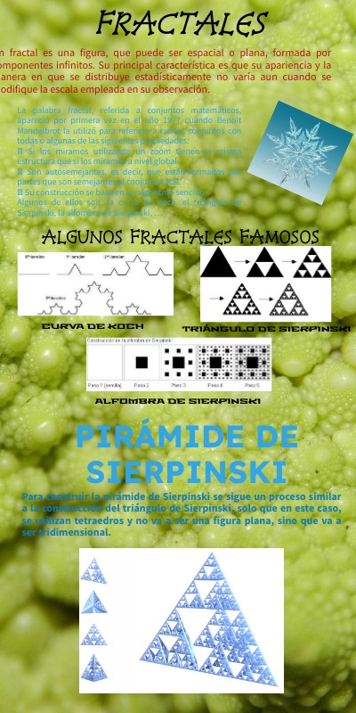 La palabra fractal, referida a conjuntos matemáticos, apareció por primera vez en el año 1977 cuando Benoit Mandelbrot la utilizó para referirse a ciertos conjuntos con todas o algunas de las siguientes propiedades: Si los miramos utilizando un zoom tienen la misma estructura que si los miramos a nivel global. Son autosemejantes, es decir, que están formados por partes que son semejantes al conjunto total. Su construcción se basa en un algoritmo sencillo. Algunos de ellos son: la curva de Koch, el triángulo de Sierpinski, la alfombra de Sierpinski, …
