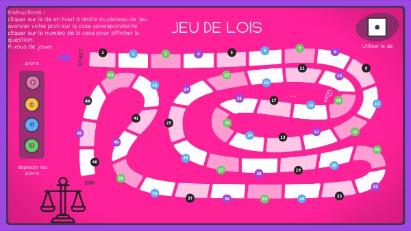 Instructions : cliquer sur le dé en haut à droite du plateau de jeu avancer votre pion sur la case correspondante cliquer sur le numéro de la case pour afficher la question. A vous de jouer