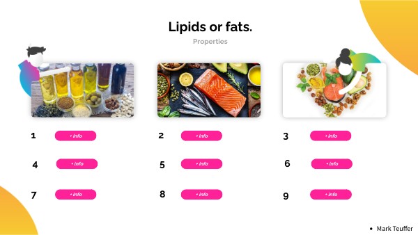 National Human Genome Research Institute. (s.f.). Enzyme. Recovered from: https://www.genome.gov/genetics-glossary/EnzymeNonstop Neuron. (2021). Transport proteins: pumps, channels, carriers. Recovered from: https://youtu.be/A9ihz5gYxU4 Instituto nacional del cáncer. (s.f.). Hemoglobina. USA government. Recovered from: https://www.cancer.gov/espanol/publicaciones/diccionarios/diccionario-cancer/def/hemoglobina Stossel, T. (1978). Contractile proteins in cell structure and function. National Library of Medicine, https://pubmed.ncbi.nlm.nih.gov/206188/ Aryal, S. (2022). Lipids- Definition, Properties, Structure, Types, Examples, Functions. Microbe Notes. https://microbenotes.com/lipids-properties-structure-classification-and-functions/ #properties-of-lipids Grupo Sobre Entrenamiento (G-SE). (s. f.). Glucógeno. https://g-se.com/glucogeno_4435-bp-m57cfb26e71cd7 Toppr . (s. f.). Polysaccharides https://www.toppr.com/guides/biology/biomolecules/polysaccharides/+#Structure_of_Polysaccharides Kaiserpermanente. (2015). Ribose. https://wa.kaiserpermanente.org/kbase/topic.jhtml?docId=hn-3949001 Vedantu. (2022). Deoxyribose. VEDANTU. https://www.vedantu.com/biology/deoxyribose Steward, K. (2019). Amino acids – the building blocks of proteins. Applied Sciences from Technology Networks. https://www.technologynetworks.com/applied-sciences/articles/essential-amino-acids-chart-abbreviations-and-structure-324357 Ajinomoto Group Global Website - Eat Well, Live Well. (s.f.). What are Amino Acids?. https://www.ajinomoto.com/aboutus/amino-acids/what-are-amino-acids Berkheiser, K. (2017). Animal vs. plant protein - what's the difference? Healthline. https://www.healthline.com/nutrition/animal-vs-plant-protein#sources Libretexts. (2022). 6.2: What are lipids? Medicine LibreTexts. https://med.libretexts.org/Courses/American_Public_University/APU%3A_Basic_Foundation_of_Nutrition_for_Sports_Performance_(Byerley)/06%3A_Lipids_Basics_-_Another_Energy_Source_for_the_Athlete/6.02%3A_What_Are_Lipids#:~:text=Lipids%20perform%20three%20primary%20biological,)%2C%20phospholipids%2C%20and%20sterols [FuseSchool - Global Education]. (2020). Protein in the diet | Health | Biology | FuseSchool. YouTube. Recuperado 25 de septiembre de 2022, de https://www.youtube.com/watch?v=Fe5wHw3pnmY