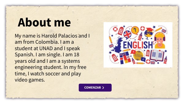 My name is Harold Palacios and I am from Colombia. I am a student at UNAD and I speak Spanish. I am single. I am 18 years old and I am a systems engineering student. In my free time, I watch soccer and play video games.