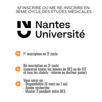 - 6 mois (semestre de novembre ou de mai) : vous devez vous réinscrire en DES à la faculté de médecine au tarif normal puis en master 2 auprès de la scolarité de master concerné (Nantes Université ou autre université