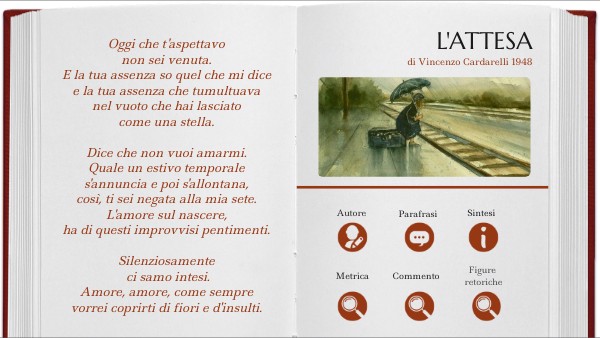 Oggi che t'aspettavonon sei venuta. E la tua assenza so quel che mi dice e la tua assenza che tumultuava nel vuoto che hai lasciato come una stella. Dice che non vuoi amarmi. Quale un estivo temporale s'annuncia e poi s'allontana, così, ti sei negata alla mia sete. L'amore sul nascere, ha di questi improvvisi pentimenti. Silenziosamente ci samo intesi. Amore, amore, come sempre vorrei coprirti di fiori e d'insulti.