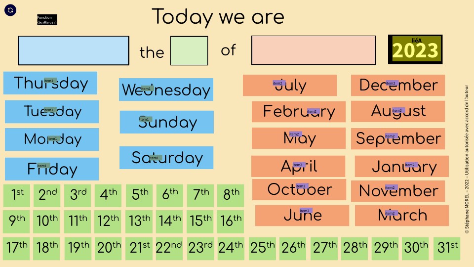Personalisez vos éléments ITEM duplicables à grouper avec une zone de texte en personalisant le code suivant pour obtenir d'autres ensembles à mélanger.Dans le code suivant, modifier le nombre après item, choisir une couleur après background-color.Dans Genially : Menu Insérer puis </> Autres , collez le code modifié, puis cliquez sur INSÉRER. Dupliquez l'élément ainsi inséré. <div class="item3" style="background-color: yellow">item3</div> <script></script>