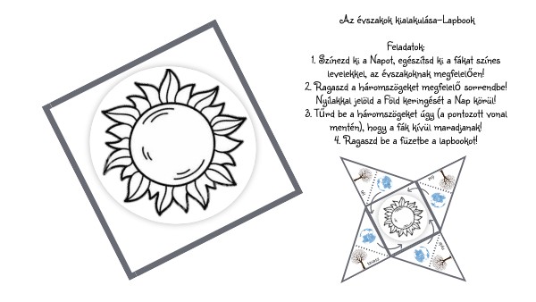Az évszakok kialakulása-Lapbook Feladatok: 1. Színezd ki a Napot, egészítsd ki a fákat színes levelekkel, az évszakoknak megfelelően! 2. Ragaszd a háromszögeket megfelelő sorrendbe! Nyílakkal jelöld a Föld keringését a Nap körül! 3. Tűrd be a háromszögeket úgy (a pontozott vonal mentén), hogy a fák kívül maradjanak! 4. Ragaszd be a füzetbe a lapbookot!