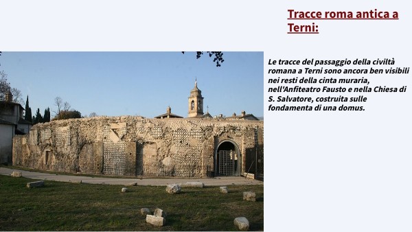 Le tracce del passaggio della civiltà romana a Terni sono ancora ben visibili nei resti della cinta muraria, nell'Anfiteatro Fausto e nella Chiesa di S. Salvatore, costruita sulle fondamenta di una domus.