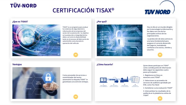 TISAX® es un programa para evaluar los sistemas de seguridad de la información de las empresas del sector de la automoción. Su objetivo es la protección e integridad de los datos, así como la disponibilidad tanto en el proceso de fabricación de automóviles como durante la operación del vehículo